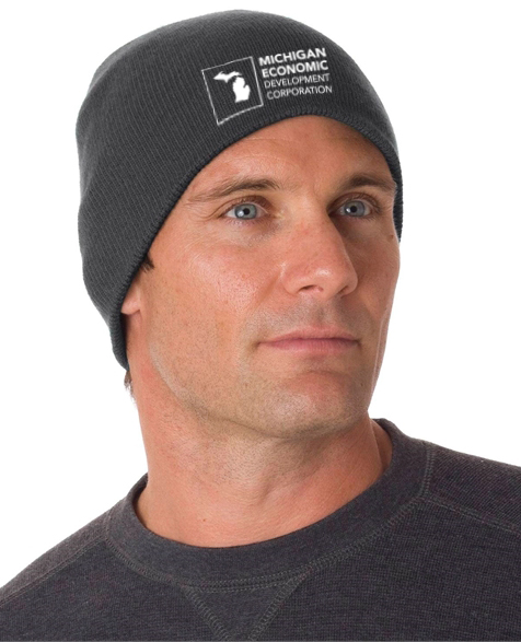 Bayside beanie made of 100% acrylic knit fabric and measuring approximately 8 1/2″ long.